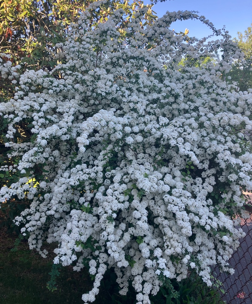 Spires blooming today in our back yard. Also, part of our double azalea in bloom not far from the spirea bush.