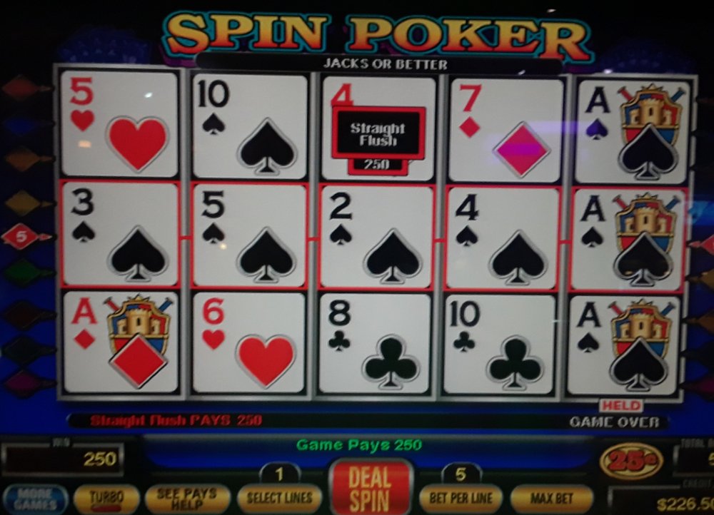 Spin poker usually has a better paytable than other games. For instance, at Mohegan Sun, I can play the dollar game on spin poker and get paid 800 for the Royal for bet one. I’m thinking of making up a template so I won’t see what comes in on the other two lines. I don’t know if the casino will allow it. One way to find out.