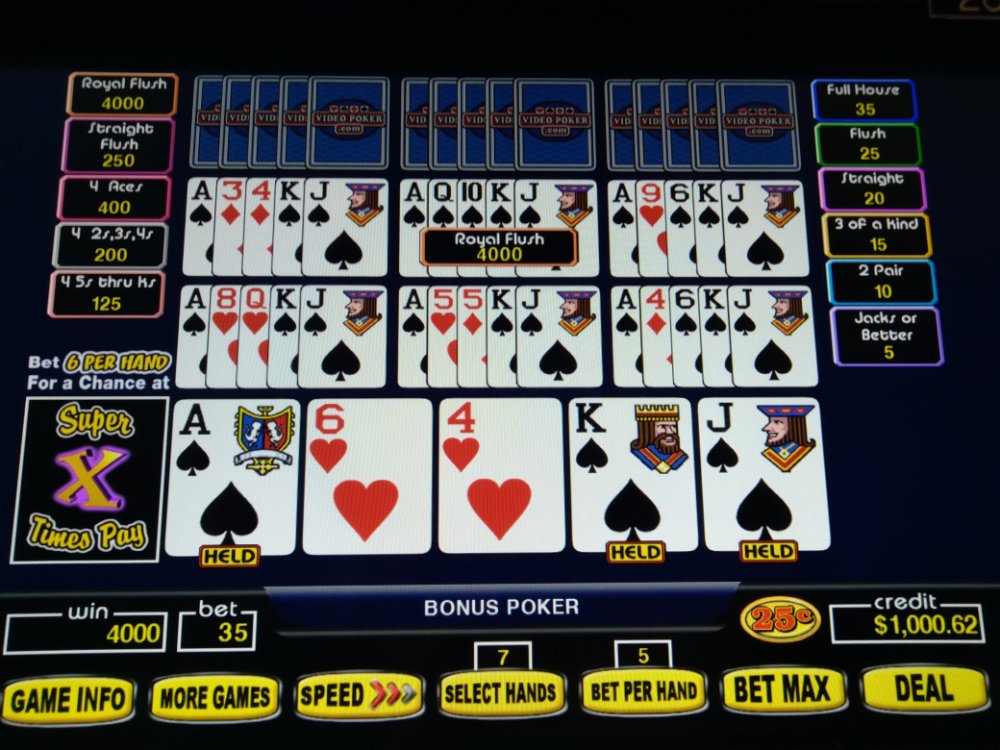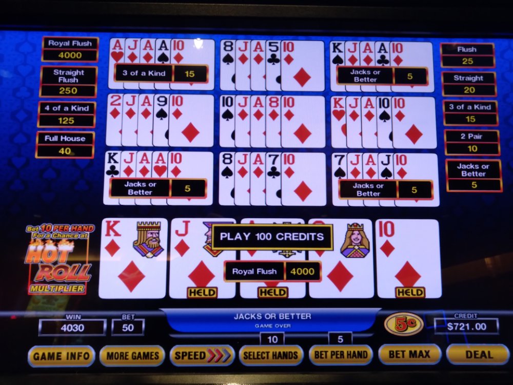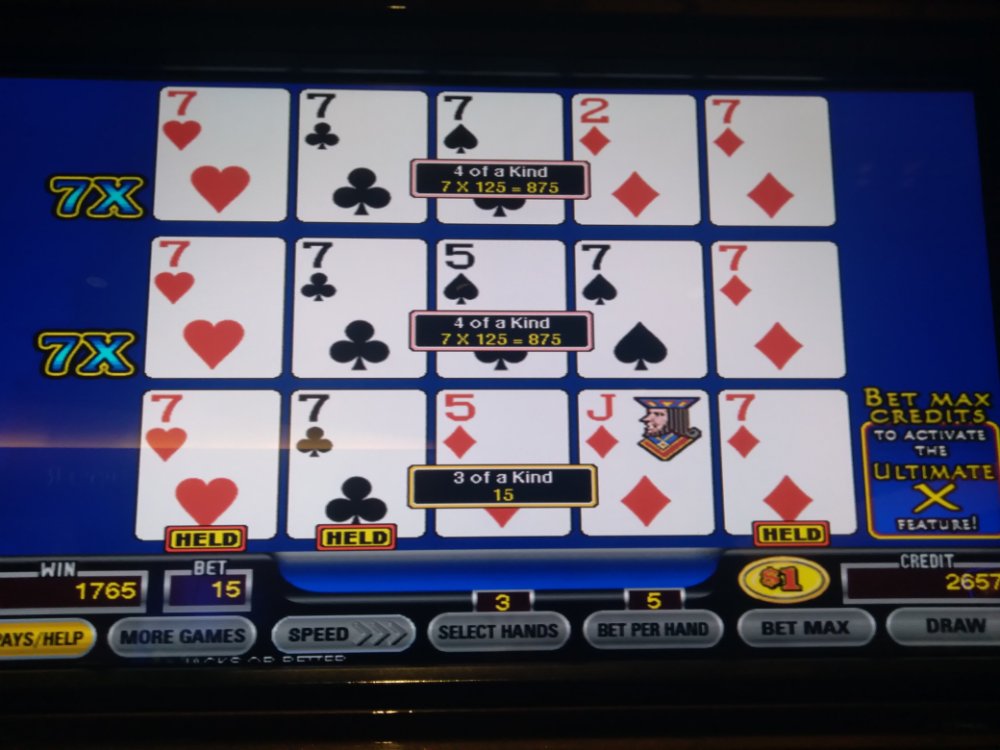 $5.00 + a 62 cent ticket along with $175 in free play. Ran the FP up to around $300 when it went south. Down to 20 credits (not counting the last 62 cents), got a double up to 40 credits playing 4 hands. Next deal playing 8 hands, I get 30 credits back. One more deal with 6 hands and a profit of 5 credits to 35 credits. Next deal 7 handed, this....