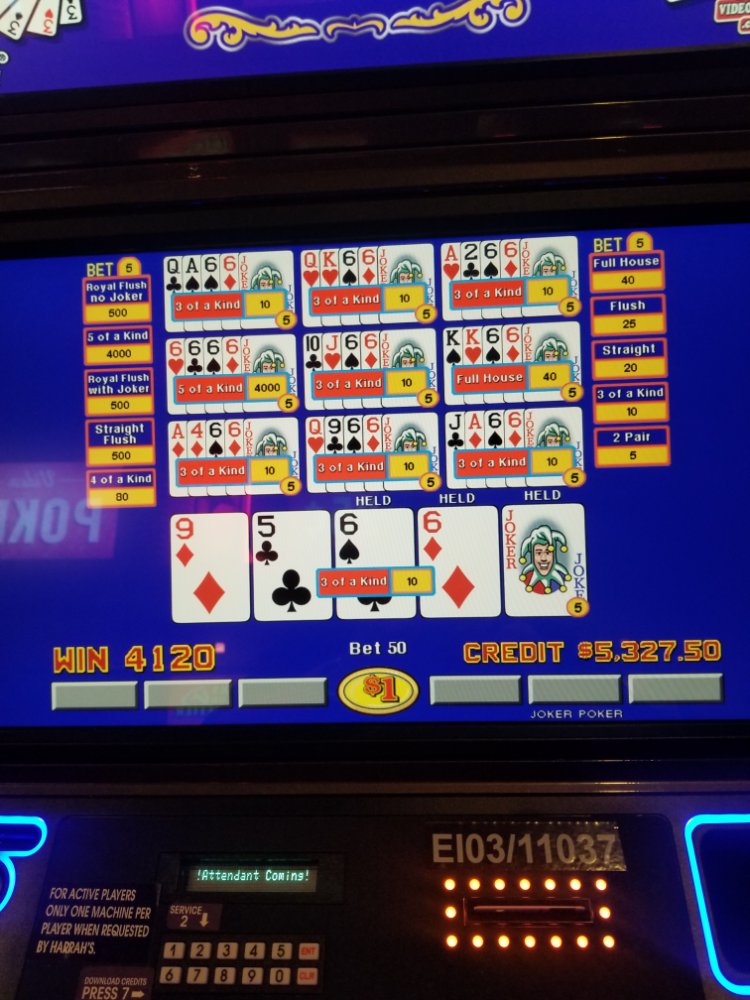 While waiting to get paid, I was dealt 666J. Hit draw but couldn't catch the missing 6. Dropped back to .50 denom after getting paid, lost $500.00, left and called it a profitable night.