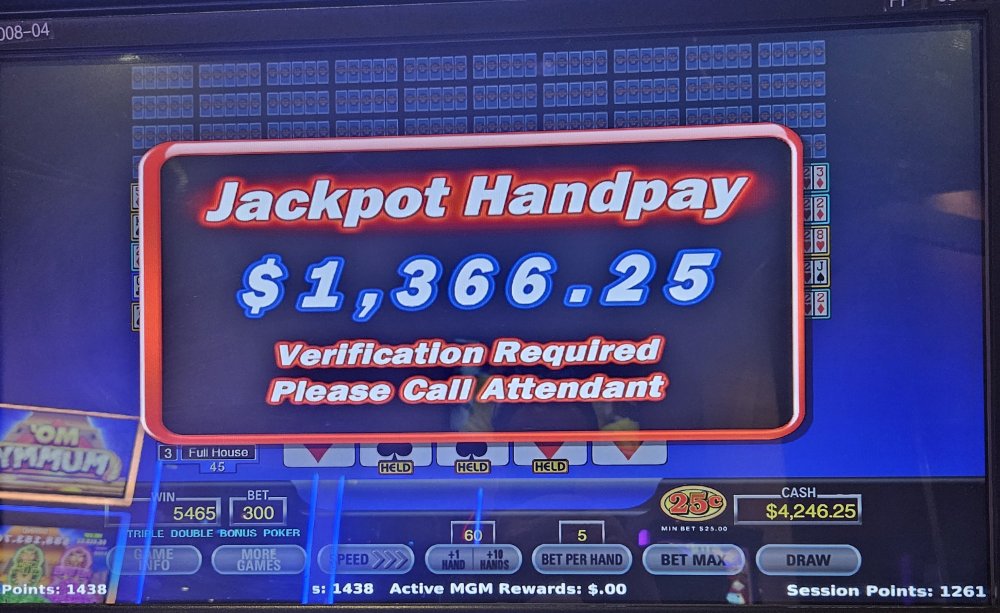 Thanks, TT. Tier credits earned at Caesars and Paris were about 2,700 each, got the 5,000 TC match for both. Cosmo and Rio, I wasn't overly concerned about theirs.TripleTriple wrote: ↑Sun Sep 22, 2024 10:45 amSome really good draws there on some really good dealt hands, as usual. Fifty to a hundred bucks a hand insists you get some hand pays. Musta earned serious Tier credits.
