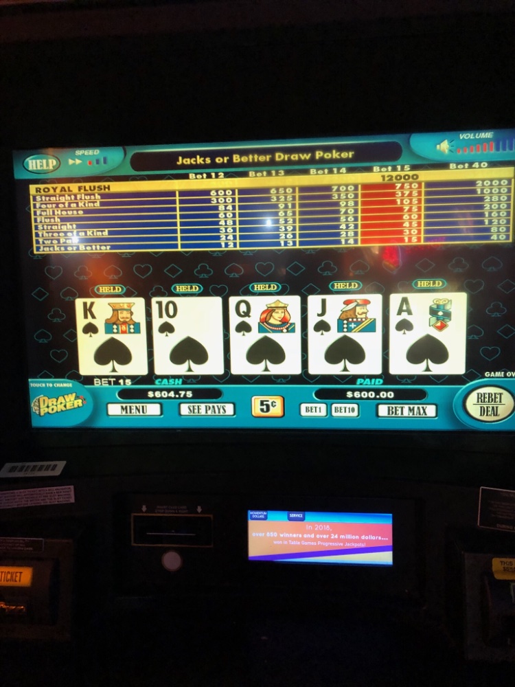 She did it again. While i was losing my shirt playing 98.8 bonus deuces, the mrs. playing horrible 7/5 nickel job betting 15 nickels gets dealt a Royal in spades good for 600 bucks. I guess somehow she managed to get the Leprechaun to give her a bit more gold from the pot. Pic attached