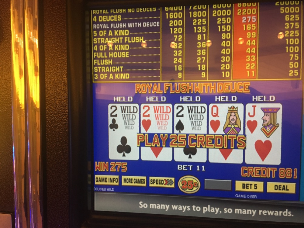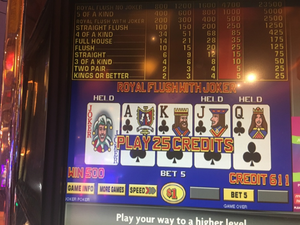 As far as the Royal goes, had it been a real one instead of with the joker, it would’ve been 4000 bucks instead of 500. I would have played very conservatively if at all the rest of the evening. When the wild royal hit, I was ahead exactly $11. Hindsight of course it is 2020. Even though I switched back to quarters and my bets never got over 2 bucks a hand, the machines were so cold the next five or six hours it busted my bank roll of 600+ another 200 I. should not have let them have. This is the world of video poker. I want all of the newbies to see if they think this game is easy they better think again.
