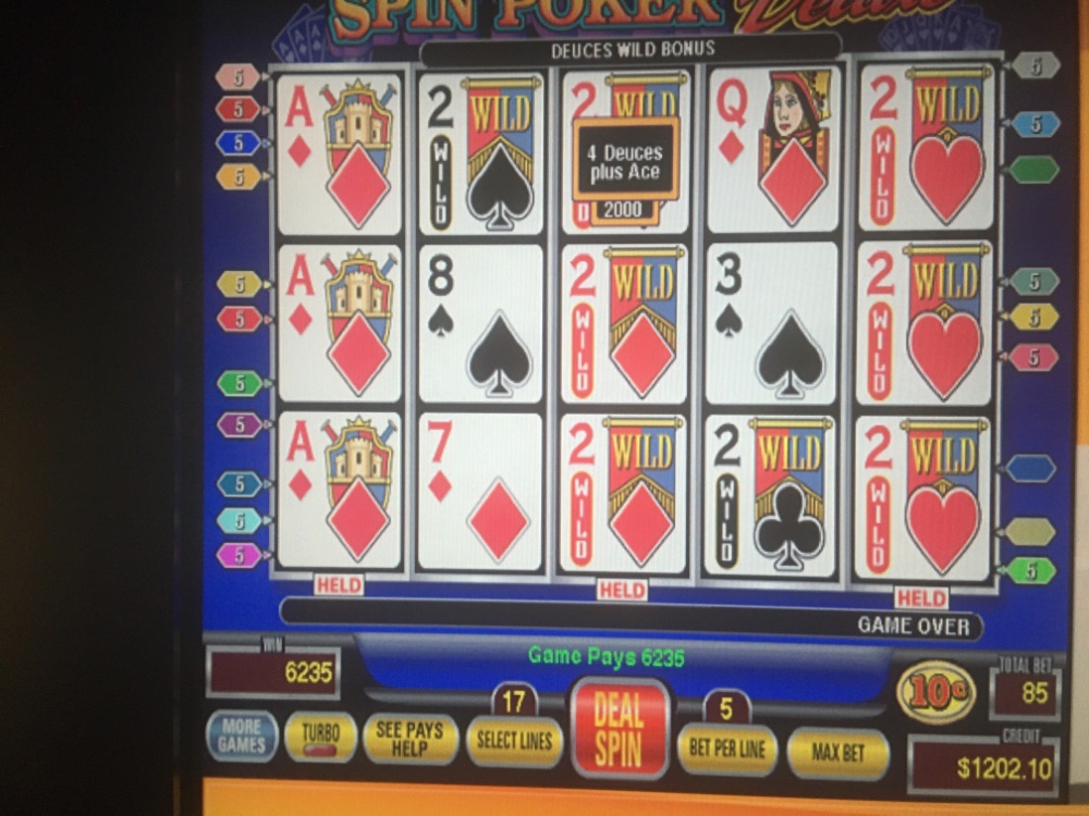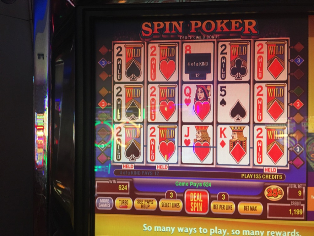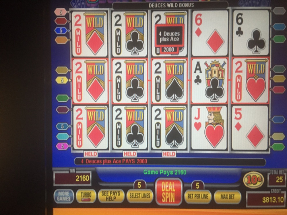 We didn’t speak at all. I notice he kept watching my play which was 3 line Joker Kings at a quarter a line 98.44 and 940/1 for the Royal. He cringed as did I when 4 Aces without a joker hit 5 minutes apart. My guess is he either played that machine earlier, or wanted to play it when I left until he saw the Aces. Most players would be too Superstitious and not play that machine if they saw Aces come out like that. I know it means nothing but even for me it is hard to overcome the superstition sometimes.