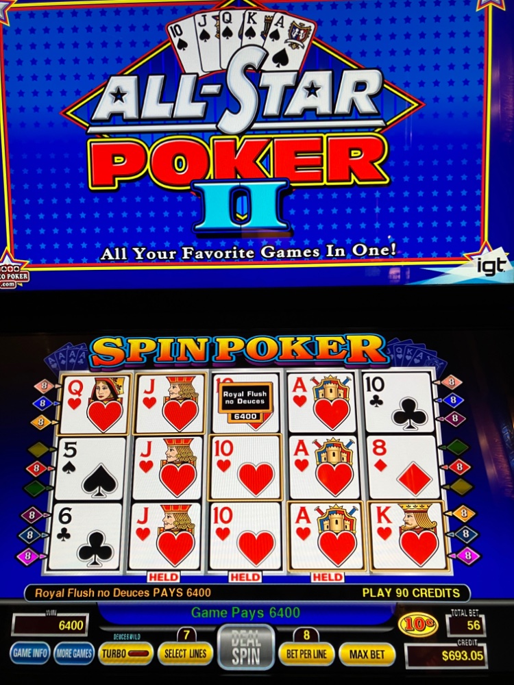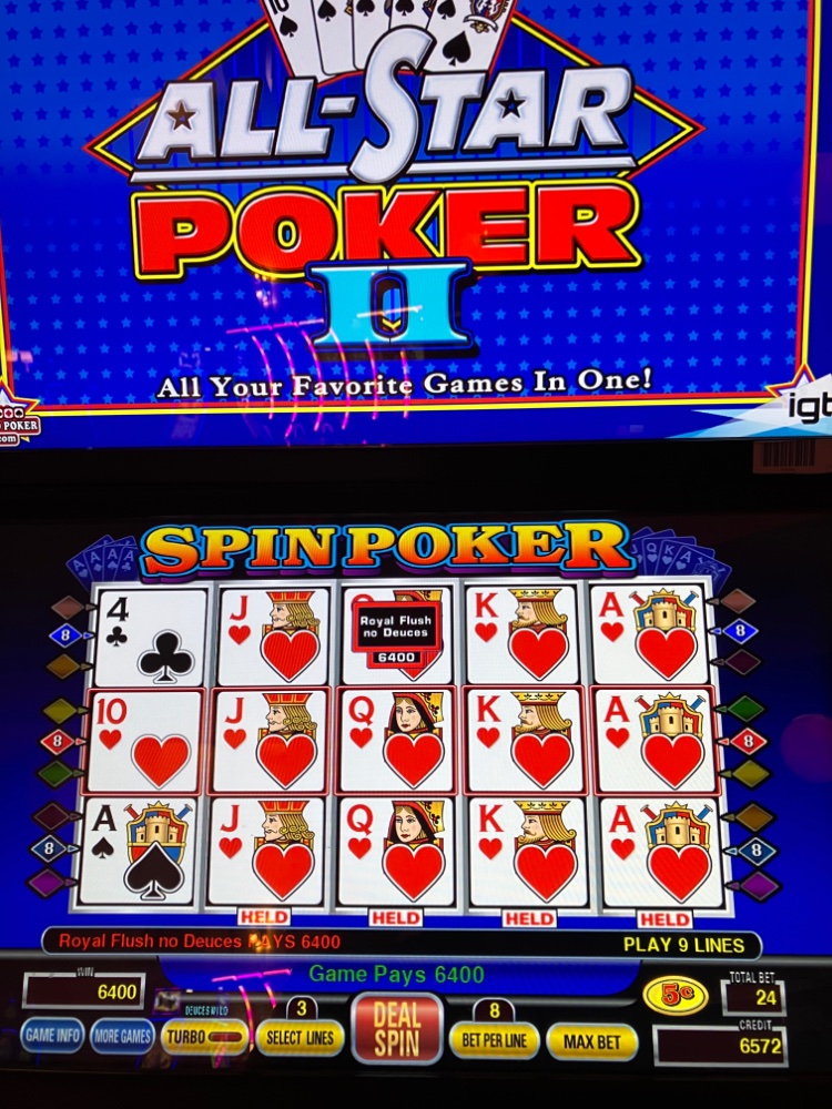 Low budget solo trip last night overnight. Didn’t play till this morning. Talk about Bizarro world!!! My bets due to using Martingale varied almost every hand in lines, amounts, and denomination. Yet somehow I managed two Royals in 4 hours, both in hearts, and the amount won in 6400 credits ( one nickels and one dimes ) was the same. Then I quit and went home. Plus 350. No complaints. Especially since it was a 96 percent game. 16/13. I’m afraid that will become the norm eventually all over. The bets had been getting very steep. Over 5 bucks.
