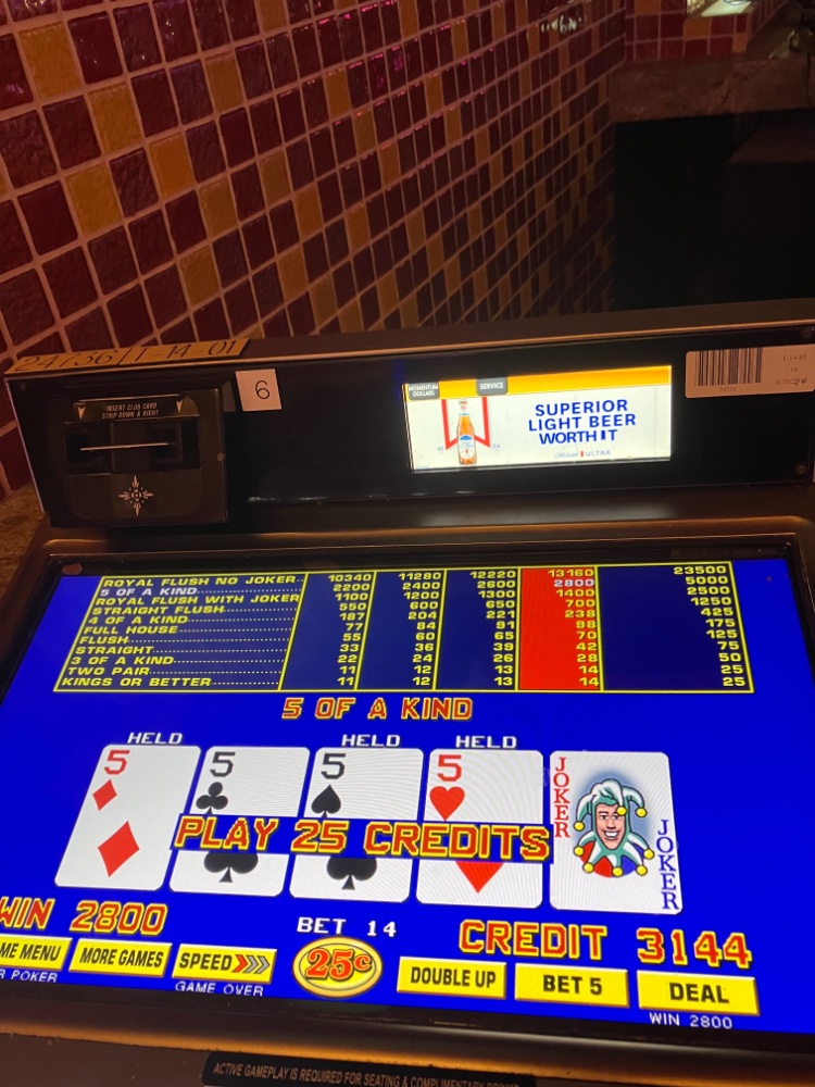 We played about 7 hours then headed home. The Mrs usual game DDB Ultimate X nickels was a struggle for her, knowing ahead of time that unless a Royal would appear, the session would be a loser without a couple of good hits with multipliers. That finally came through for her enough to break even. Pics tomorrow.