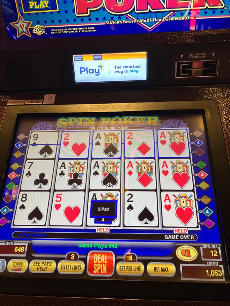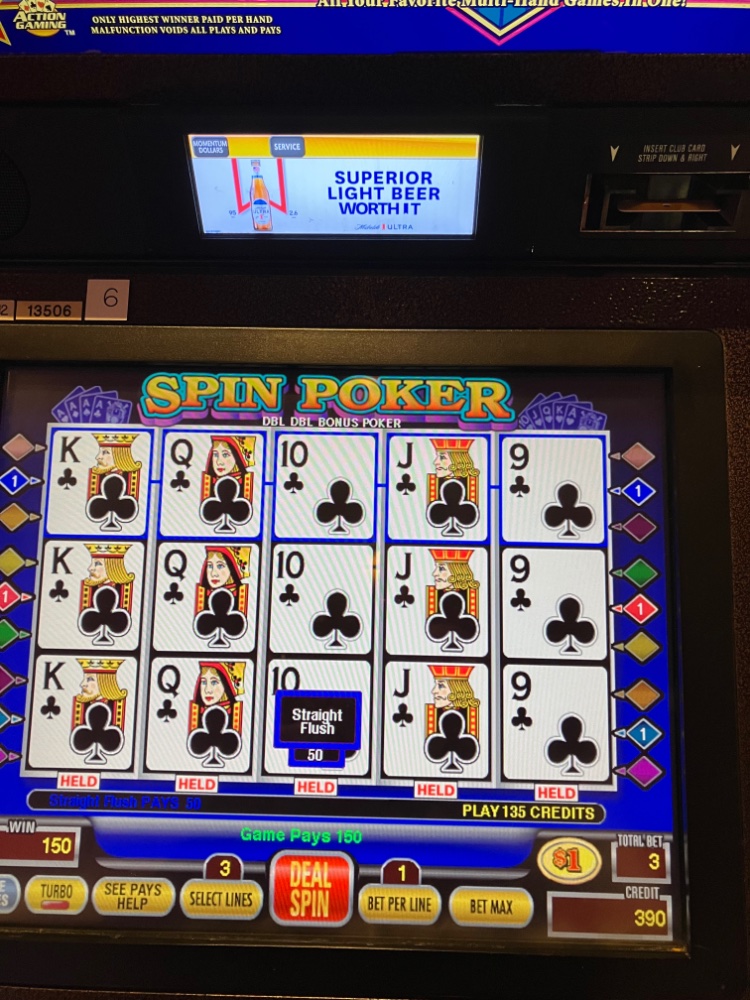 I went back up Thursday evening and played dollar DDB which I never do. I guess it was the Mrs track record compared to mine that convinced me to give it a try. On my 800 for one machine, I could only get 9/5 not 9/6. I came very close to getting a dealt Royal ( pic ) Hit 4 Aces once, but overall was on the ropes and near the end of my rope as well when the hand pay came in. ( bet was way too high ) but that’s where the Clone took me. I ended up even after 7 percent for the stupid State withholding. ( my choice ) to avoid a big estimated tax penalty. I didn’t play Ultimate X which the Mrs prefers. I don’t think my bankroll would have held up unless I had other high multiplier hits along the way. On the way home, today I just missed hitting a coyote wolf hybrid on 95 in Old Saybrook. Literally by an inch or two. Ran right across the front of my car from the woods. Something told me to slow down from 70 to 55 and I did. Seconds later…..there he was. Big too!!