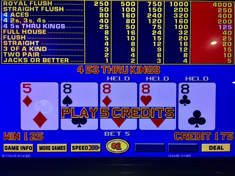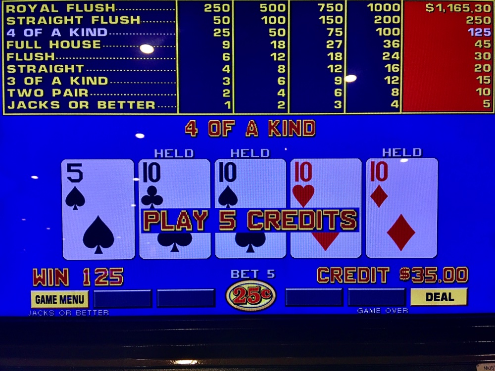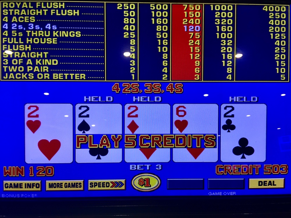 Tedious Tuesday. I won my $25 Caesars table FP on a yo. I won $11 on my $25 quarter JOB FP. Medium quad after two hours. Medium BP quad deuces five minutes later. I jumped out of my seat and slapped a bald cigar smoking Diamond Elite’s back. He asked, “You too?” I was puzzled. On a machine I’d played earlier but failed to regain, he simultaneously hit a $2,000 DDAF quad Aces/kicker. Carousel was suddenly hot as all hell. Net Day: -$33. 48 TCs.
