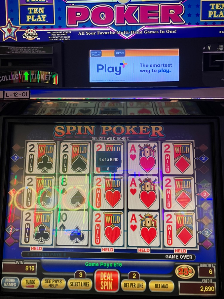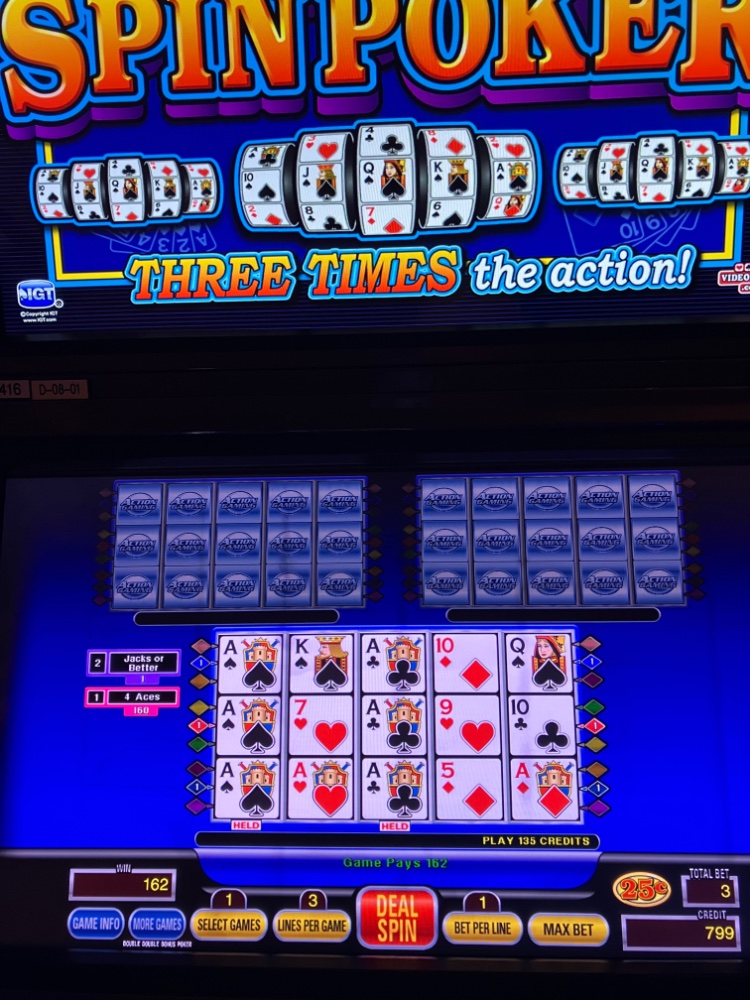 Solo Sunday evening trip planned. As of now, I plan on giving DDB a shot, but quarters this time. I can get 9/5 on a quarter game that pays 800 for bet one. Starting with 75 cents total on 3 lines sounds good to me and easier on the Clone too. If I can keep discipline in order, I will try and wait for a loss of 50 times my starting bet before advancing to bets of 1.50 or 50 cents a line. That’s the plan anyway.