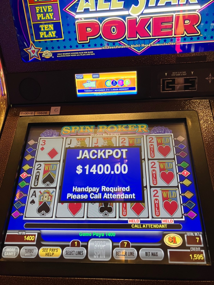 . One of the times it was 5 Aces. I should have taken a pic because it was a nice hit as well for 400 bucks, but I was on low battery at the time. As usual, forgot to charge the phone on the way up in the car.