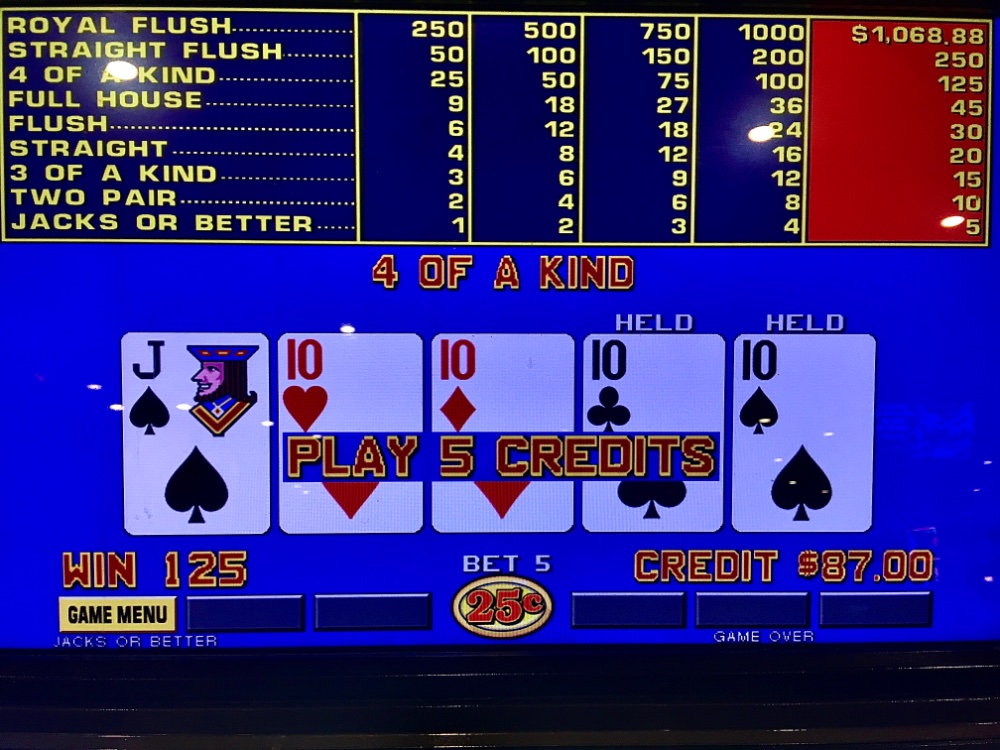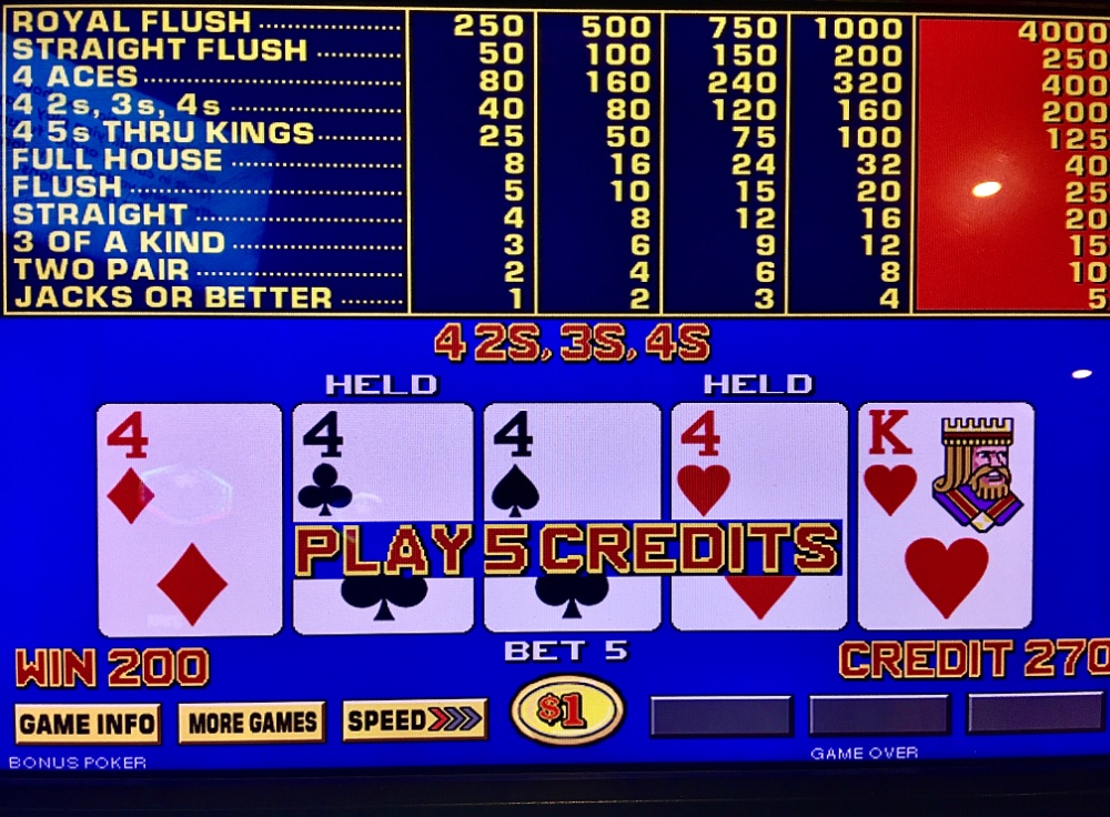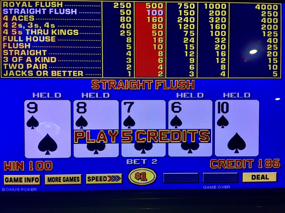 Thanks all. But not optimal. I inexplicably dumped the cash cow machine to swiftly lose $100 on its neighbor. Too upset about the two coin SF bet to think straight. Remarkably, my net exceeded a max SF and exit, my usual policy! Hell bent on bailing out my shorting. I just did not trust cash cow to keep up its end, despite seeing many jackpots on it. I could not envision two premium hands in short order. I should just maintain a laser focus on it in the future. I also stayed and paid on RIP JOB carousel. It ultimately was a rip job, all right.