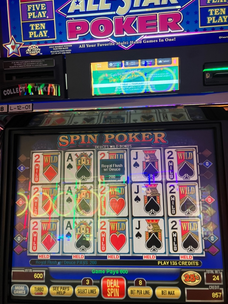 The Mrs and I had a nice overnight trip at Bizarro. Everything comped and the casino actually was kind to us in our VP play, though my session was a longer Marathon than the Mrs. She had one nice hit and quit a hundred bucks or so ahead. I did my usual Marathon and was eventually rewarded while playing the Clone on bonus deuces wild. ( both dollar and quarter play ) I saved my JOB play for another trip. Pics attached. There were a few other good ones too. No hand pay jackpots. No problem.