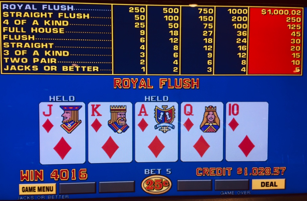 Spectacular Saturday! I won my $25 Caesars table FP on an unlikely ten craps hit. I won $38 on $25 JOB FP. I was indifferent about playing, as the progressive had just been reset. I moved, seeking an even $50 while tolerating a button slammer. I held a Jack and Ace, but came up Aces instead of getting jacked and slammed. $1,004 Royal Flush! Jump party, so I missed the run up. By the time I got my check, a Borgata side trip felt hopelessly moot. The previous player must have left their change behind, thus the strange credit total.
