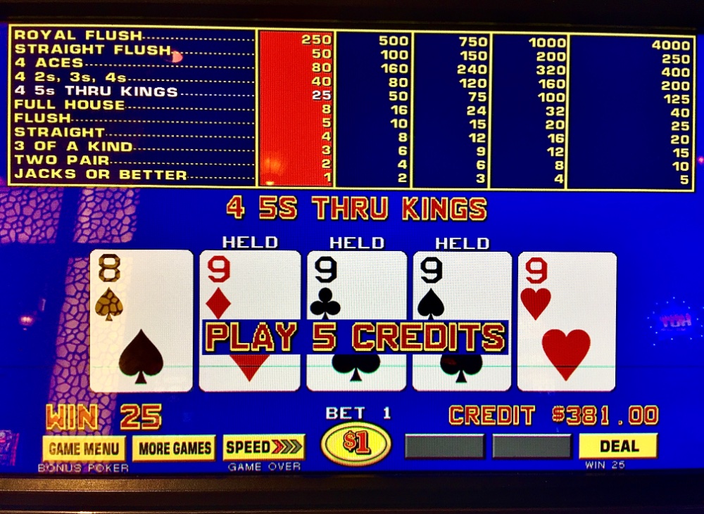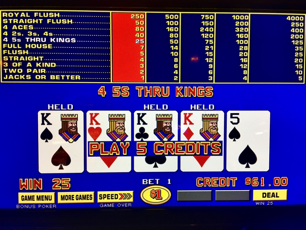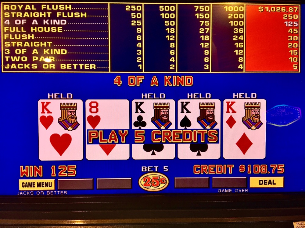 Fine Friday. I lost my $25 Caesars table FP on a four to out. I won $15 on $25 machine FP. I left +$40 after a max quad. Regrettably, all returned at Resorts despite a small quad. Lunch at Rockets. Back at Caesars, machine did well until I lost $45 in a furious dud streak. I hit dollar BP and it hit back. I parachuted to safety with a max quad deuces. Net Day: +$71. 29 TCs.