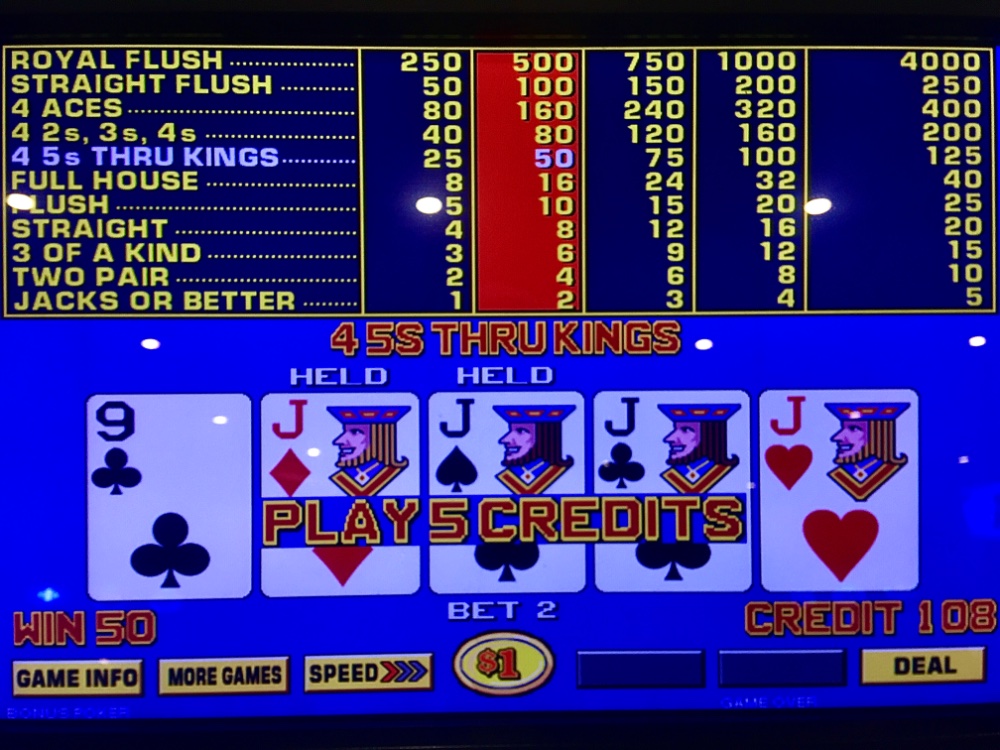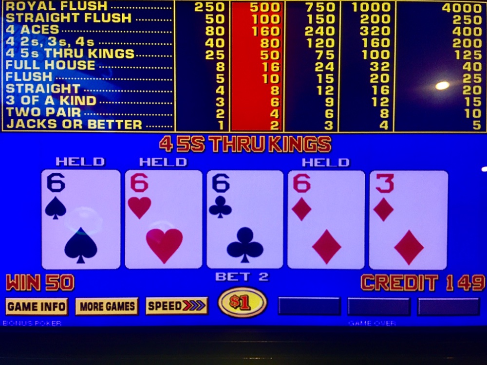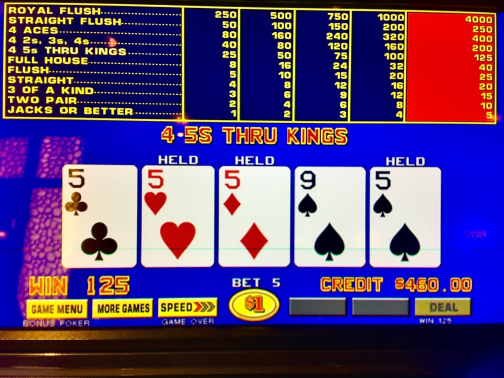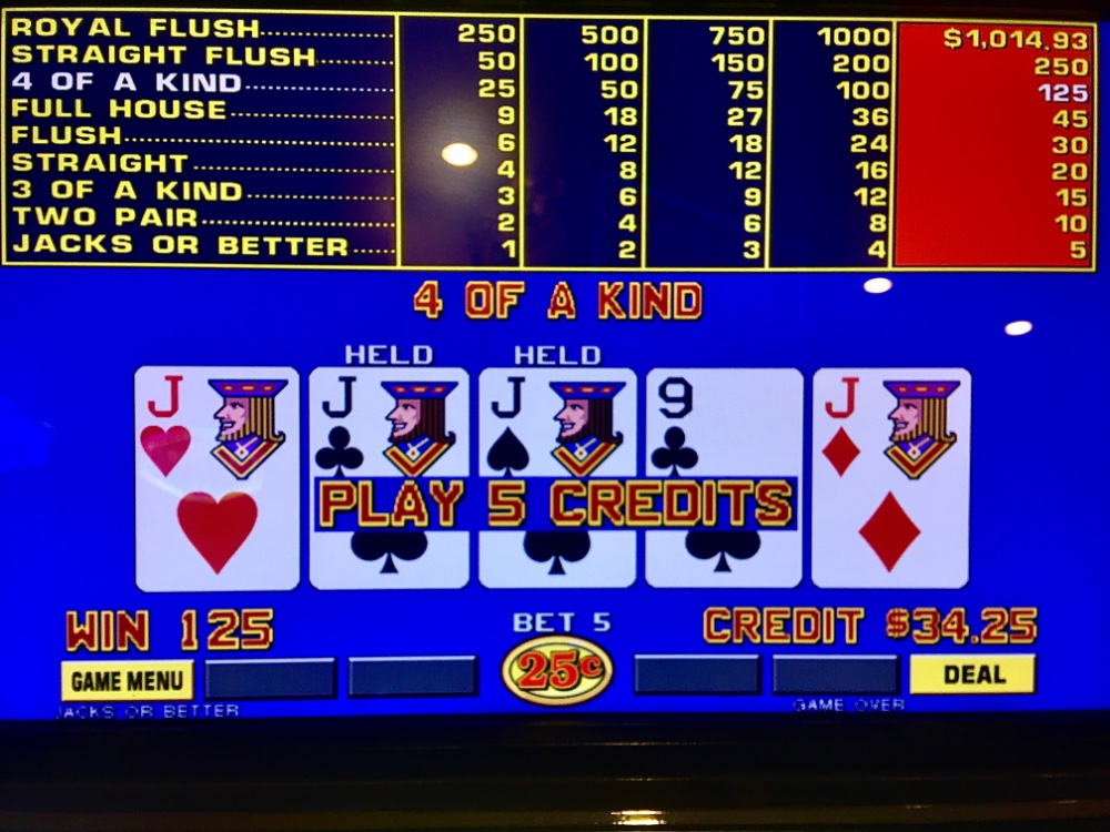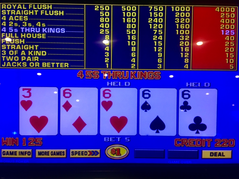Winner Wednesday. I won my $25 Caesars table FP on a six point hit. I won $13 on my $25 machine quarter JOB FP. I racked up 46 TCs on dollar BP for $40. Resorts stroll was fruitless. A nines quad put me +$1. Sports book for two hours; return stroll. I debated Ruth’s Chris HH; machines did sizzle for me. A small quad six within 20 minutes. A max quad 15 minutes later. Max sixes 30 minutes later. I tilted pursuing a premium quad for -$190. Then my old pal Straight arrived for a bailout! Net Day: +$280. 139 TCs.