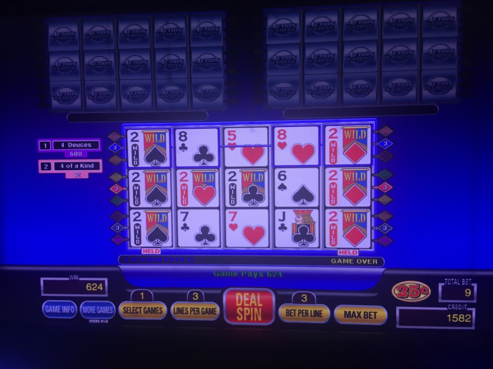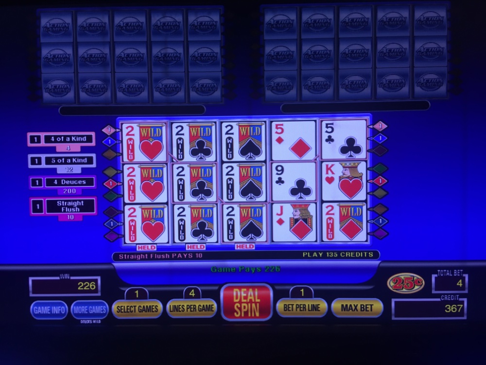 Last night’s solo trip was negative, but I was determined not to go through another large bankroll. Dropped a total of 240 on 3 horrible cold machines in an hour or so and resisted temptation to hit the ATM. At least this morning I was able to turn my 15 bucks in free play into 30 and their 10 bucks in perk points bought me less than 2 gallons of gas. At 47 mpg though, it covered the ride home. There were several Bizarro events. Back to back dealt straight flushes on Deuces Wild, four consecutive straights on Deuces Wild, and 3 Wild Royals in ten hands all on the same game.