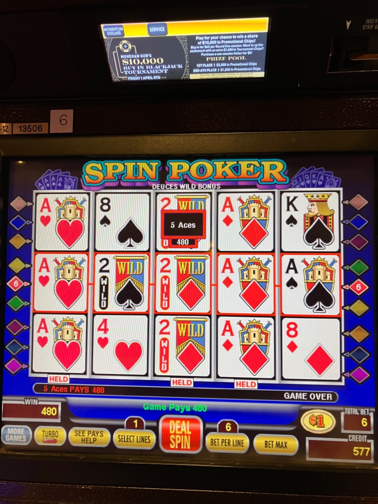 Typing this, The Mrs. who is playing in a different part of the casino on nickel ultimate X double double bonus just won 4800 nickels. She got four 2s with a 12 X multiplier. good for her.