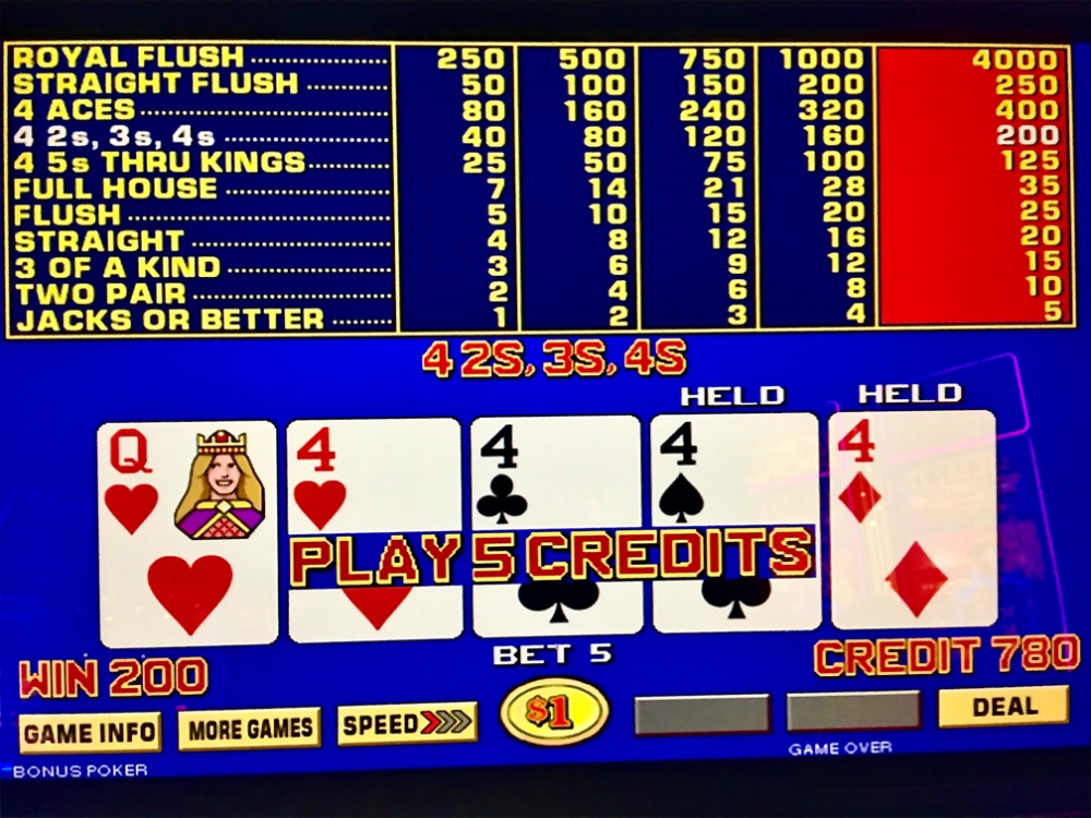 Sweet Saturday. I won $120 on my $30 Resorts BP FP; a $15 bet yielded a FH. A max quad soon came and I left +$165 net. Train jitney to station for $1 McD large fries and a Puma store tee shirt. Jitney to Harrah’s. I tried to evade an hour of losing by arriving an hour later; no such luck. Max premium quad an hour later. A $4K TDB hit at my machine upon Resorts return was right on cue. Net Day: +$222. 131 TCs.
