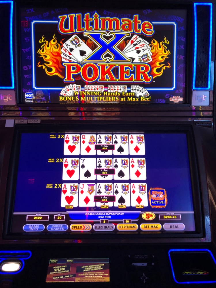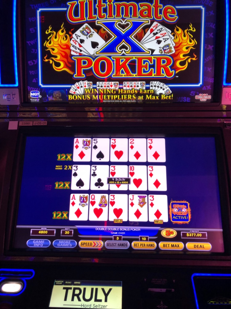 Here are a couple of the hits from the Mrs. I wanted her to send more to my phone, but she said no, the 2 best ones were enough. She had about 6 other really good ones. We both played long sessions. She plays DDB nickel 8/5 Ultimate X. Not a good paytable, but manages to beat me up every year. She plays a steady1.50 a deal. No Clone for her.