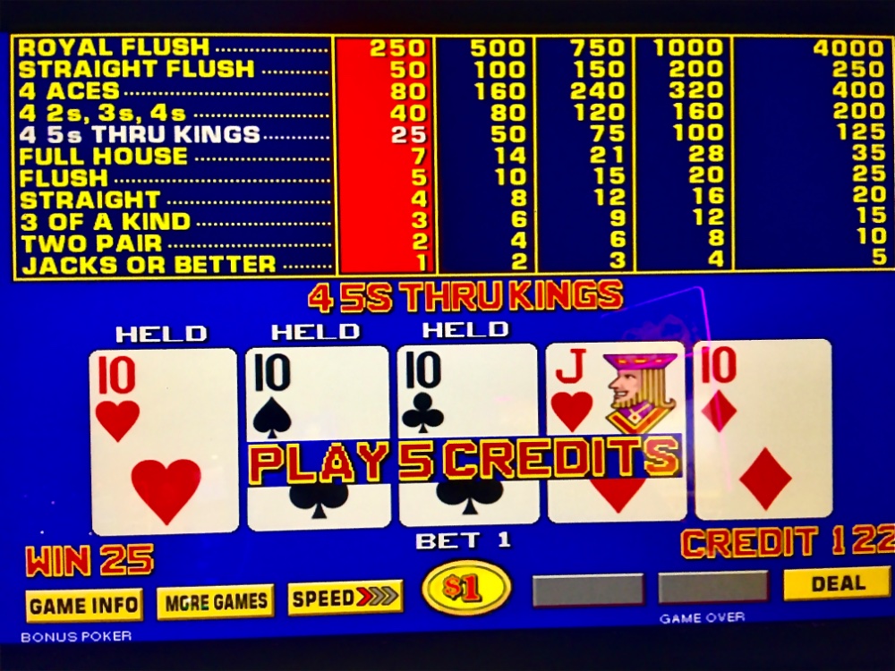 Scuffling Saturday. I won $10 on my $30 Resorts BP FP; too passive early. My quad took forty minutes, so I gave back $50 in winnings to hit it. Jitney to Harrah’s. I saw a TDB FH hand pay and an AWAK elsewhere. My small quad took forty minutes. I was so upset that I shifted to the next machine for a max quad three minutes later. Shuttle to Caesars and walk to Resorts. My premium quad streak continues, albeit a poorly timed medium. Net Day: -$25. 89 TCs.