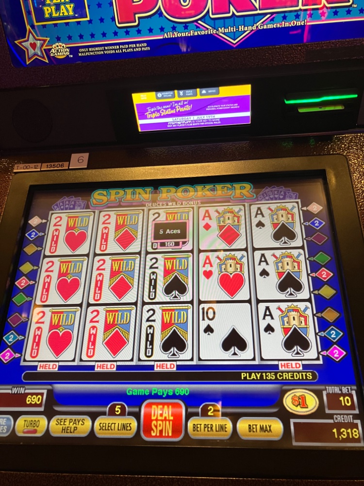 Back from Bizarro. I had a big budget this trip in hopes of staying somewhat under control. Not bad. In 10 hours of play, I had many hours of very long dud streaks, but the Clone kept me alive. I made only 10 bucks, but finished up the Mrs needed tier points for the Ignite status. At least that will guarantee her 50 in free play every month and lounge access too. Dont know if they will grant additional free play or other comps. Maybe not, but it’s better than 0. Here are the best hits. One was on DDS a big one and only 97 plus pay table. I only played it because on Triple status days like last night, you can play twice as fast as Draw Poker.