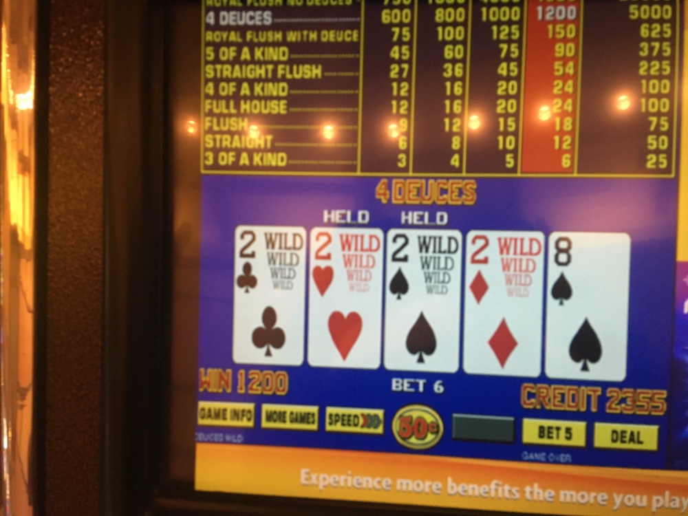 Up there tonight for an overnight solo. Put another nice dent in my huge 2022 vp deficit. Such a strange game we play. Unfortunately, my deficits are compounded by the market, but I guess many of us are in that boat right now. Hard to tell from the pic, but the game is Bonus Deuces Wild Double Down Stud so the quad deuces even with a quarter bet after doubling pays 200 bucks. Of course they have to be dealt. I think the frequency is about the same as hitting a non dealt Royal in draw poker.