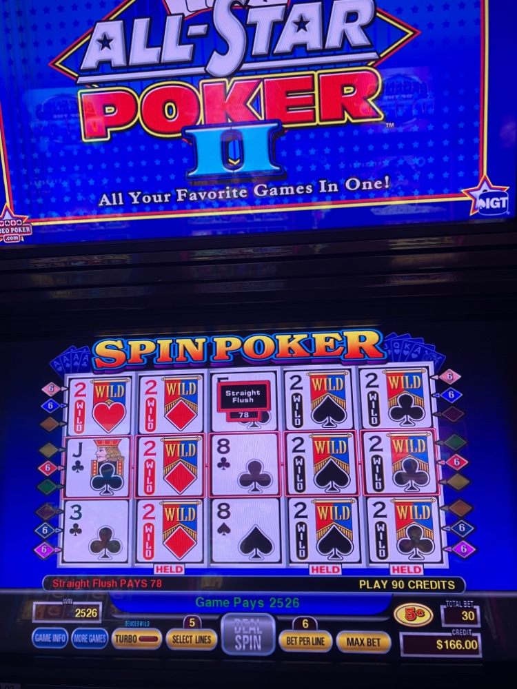 Had a nice Birthday and break even trip. No pics, but we got even late Monday afternoon after lunch when we played the dollar 98.8 Spin Poker machine on Bonus Deuces Wild. ( 800 for bet one machine ). We played 3 lines at a buck a line for about an hour. After losing 100, it gave us quad Deuces on the top line leaving us plus 100. We decided to play another few minutes and in 5 minutes it gave us quad Deuces again on the same line. That added another 200 so we packed it in and headed home.