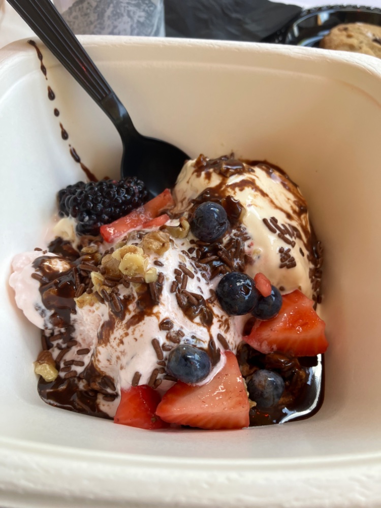 Back from our last Bizarro overnight probably for at least a month after all the Med stuff gets done. We went up for a summer picnic there which was pretty nice and low key. Struck out on the cash drawings that had 25 1,000 buck winners and one grand prize winner for 25k. Played with just nickels. The Mrs too. She had one really nice hit. I had one good one too. Her pic I will post in a day or so. We both made gas and dinner money and were fine with that. We both managed to survive and beat the 97 percent machines. That always feels good to do that. Here’s a pic of my last indulgence for awhile. Make your own Sundaes at the picnic. I can’t decide which was better! The Sundaes or the 4 Deuces hit, but I think the ice cream is gaining the edge.