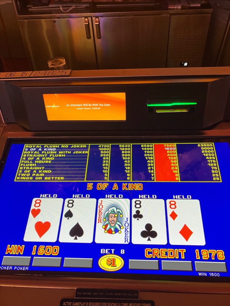 We had an overnight Sunday evening. Nothing special to report. I played 9 lines on Spin Poker nickels. Luckily, it was an 800/1 machine, but only a 96 percent pay table. After a number of losses, I advanced to 2,3,4 5, all the way up to bet 10 per line and the results were not good.