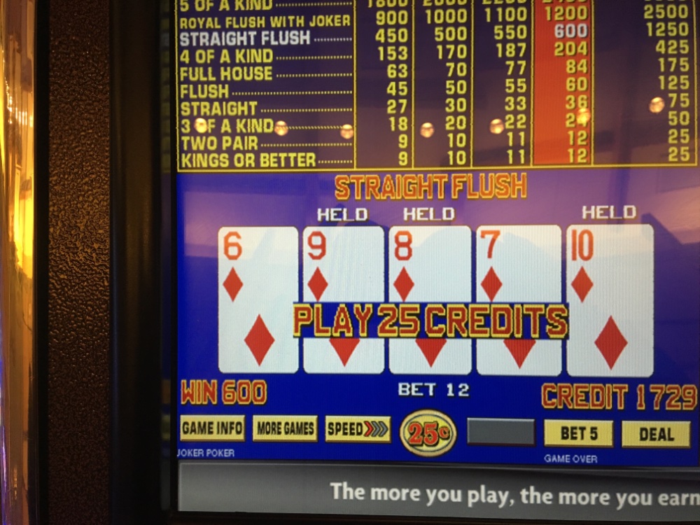 Made a quick up and back trip last night to Mohegan Sun. Just went for dinner and to play a couple of hours. No comp room offer so their loss our gain. When they do that and cut back on room offers, we both are more likely to get a bit ahead and quit rather than give it all back. That is exactly what we did last night. The Mrs hit Aces on nickel DDB and made 100 and quit. I played Joker Kings quarters with the clone method and hit 4 straight flushes in 2 hours and numerous quads. Plus 200 for me. One pic attached. Whatever happened to the get em there keep em there philosophy?