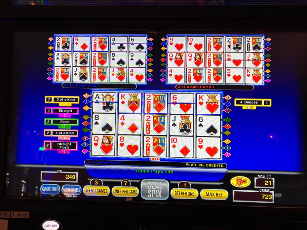 Roughly 10,000 coin in and 10,300 coin out. Equals 1.03. If I could do this every trip, I would be very satisfied. It was a long session though. About 9 hours not counting a few breaks. Only about 20 spendable points were earned. Those went into the gas tank, so I guess that would up the EV just a bit. Like .002. Again this is only one session. Just like you can catch a windfall session, you can catch a horrible dud streak and bust a bankroll between 1,000 and 2,000. The way to avoid that is cut your losses and quit, or start over with a minimum bet following the same rules. Also worthy of note is Iwas not dealt any windfall hands this trip. The potential is there however. Just before I packed it in for the trip, my bets had reached 9 bucks a deal. Tooooo. Much!! With a 400 buck bankroll. However, a dealt Royal would have landed 7,200 bucks and dealt quad Deuces 1,800 bucks.