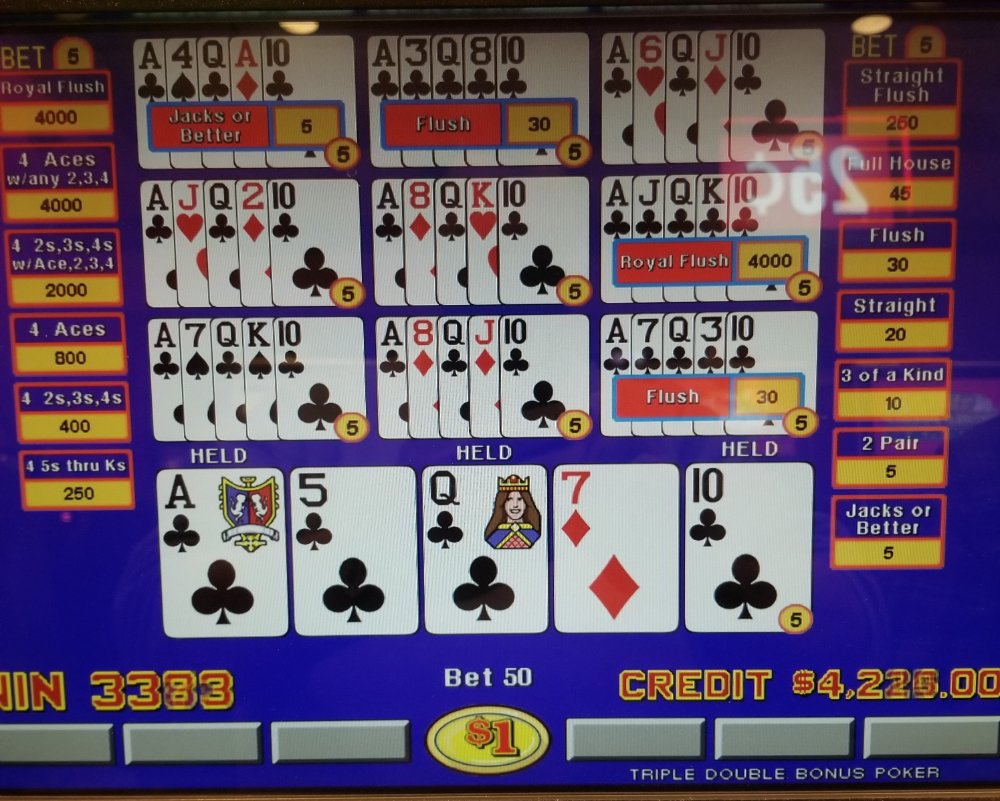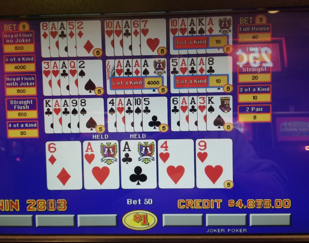 I got cabin fever Saturday night so I took a drive over to Harrah's Joliet. Upon arrival I found my favorite machine occupied so I went to another bank and promptly found myself in an $800.00 hole. I noticed the other machine was open and I'm glad I jumped. I hit the royal first on TDB, then came the quad 3's, also on TDB, finally to close out the night the 5 aces on AC Joker Poker.