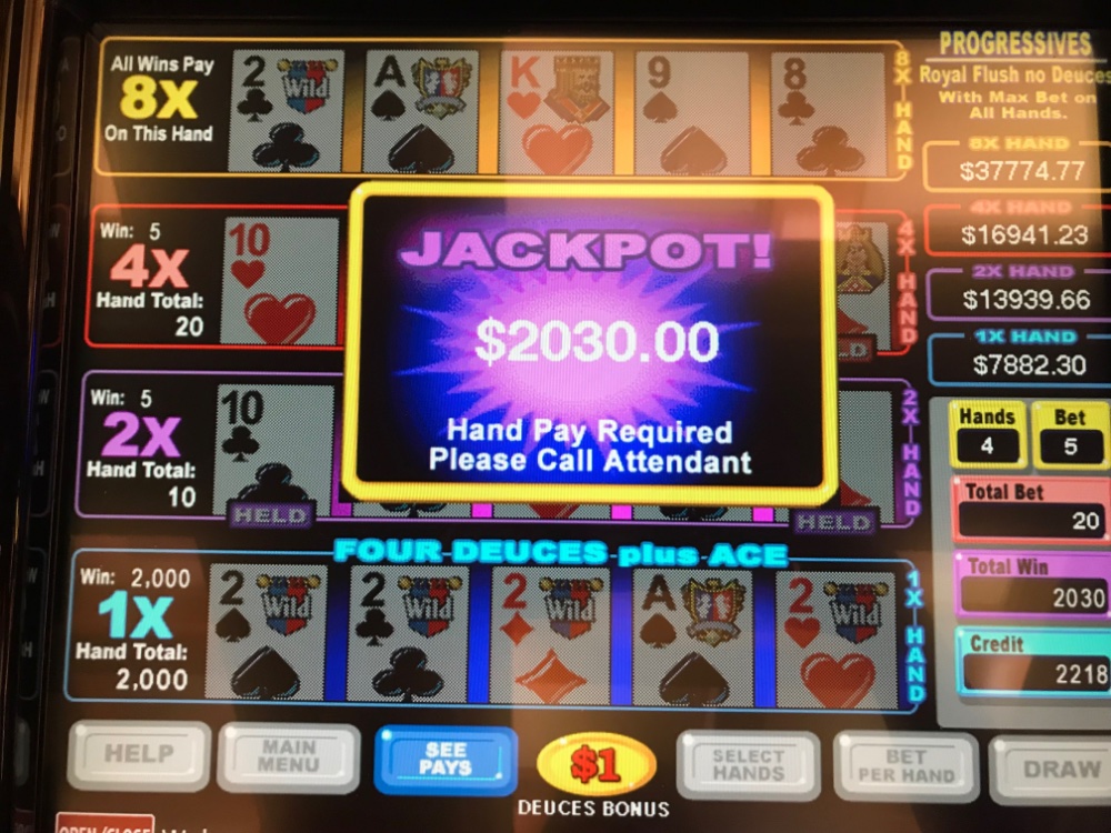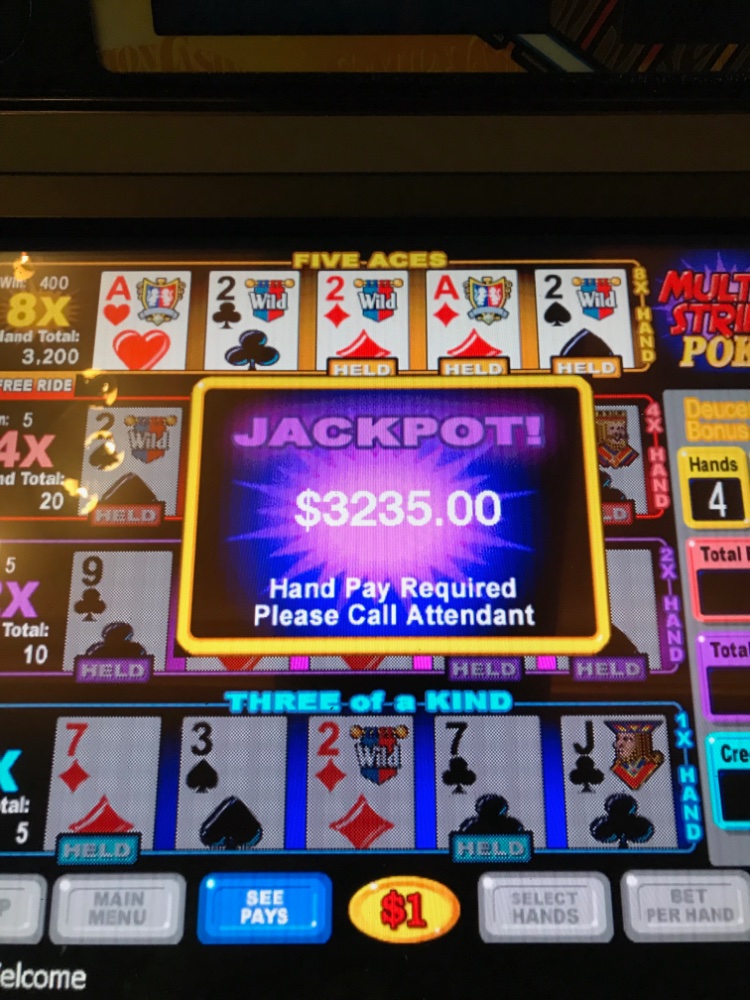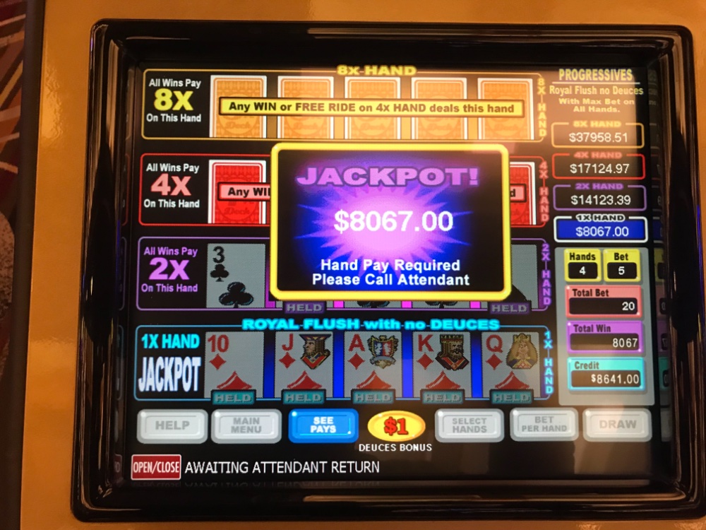This is Carrie's favorite along with Red Rock. Our is Red Rock but she killed GVR back on their recent trip. Carrie is into the Multi-Strike (MS) game has been very lucky. Since probably the only MS game in Louisiana is at Coushatta she plays their occasionally. The machines love her and respond especially if you are playing the 50¢ and $1 denomination. For those who don't know MS, the game has 4 or 5 levels (20/25 coin) and you have to hit to move up to each new level with a multiplier for each level doubling 1X, 2X, 4X, 8X or 16X on 25 coin. I'm attaching her hits over the three nights. It became a running joke with the slot attendants to just hang around. On the last night I told her I had a premonition she’d hit the progressive royal. She did later that night unfortunately not for the $37K.