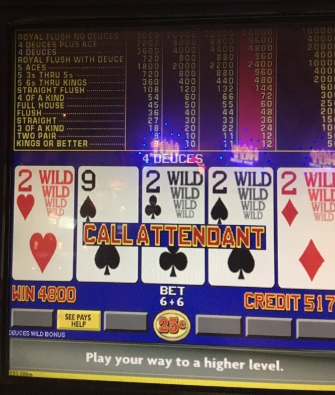 First, thanks Ted for fixing the photo I have to learn how to do it. For Bob, the poor photo doesnt really show that this is a DDS game. So, as you know the strategy is really easy. Because the return is only around 97 percent, I only play it as a last resort when bankroll for the session has been all but busted. For this session, I bailed out on my 800 for bet one Bonus Deuces Wild dollar game. I was just very lucky to hit this. The gane I bailed on is just under 99 percent