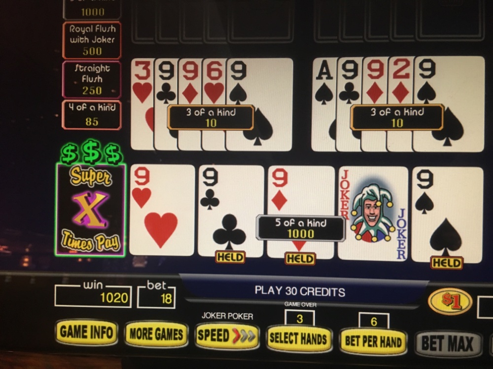 The worst thing about super times pay as you can see from the way I am playing it above is it cost $1800 per hour to play it assuming 600 hands per hour. The $1800 is just the cost of the extra coin times three for three lines played. Sometimes there are long stretches where the multiplier is not coming in and when it does come in you don’t get any good cards to even hold many times. I rarely play this game and probably won’t in the future. Today, the game bailed me out and without even using the multiplier feature.