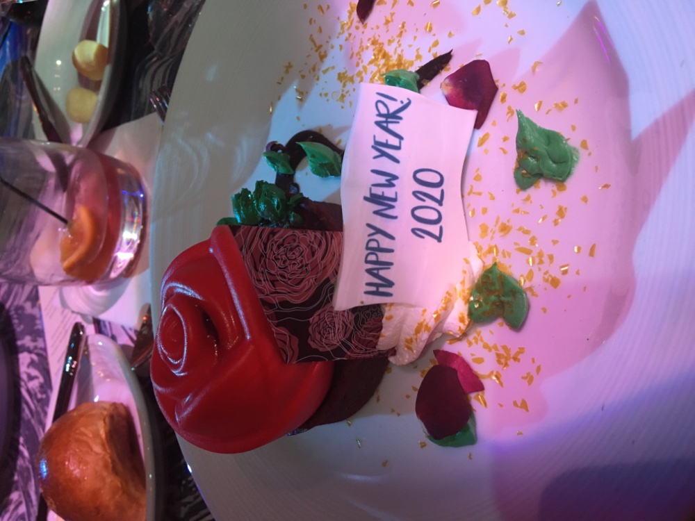 By here is the dessert that went with the meal. The rose was filled with raspberry sauce the lettering was chocolate first class all the way.