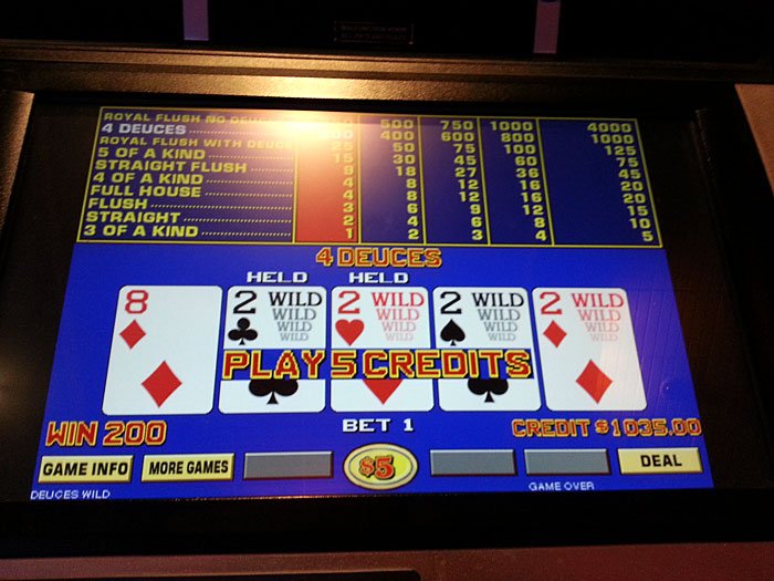 This was during the two year period when I was testing the long term results of CS. All of this has been talked to death on this forum before, so there is no need to go over it again. I was doing well with one dollar CS, so I decided to try it on $5 machines. Right outside of the high limit room in the main casino there were three $5 video poker machines. I played $20 in each machine. The first time I played them was when I sat next to the lady that scorned me for winning $1,000. I've written about that before too. The second week I hit another $1,000 quad deuce. The third week, I hit a third $1,000 quad deuce and the wild royal. If you look at the third photo above, I came one card away from a $5,000 quad deuce on that hand. The forth week, the casino disabled the coin buttons forcing me to play $25 a hand. I did not take the bait.
