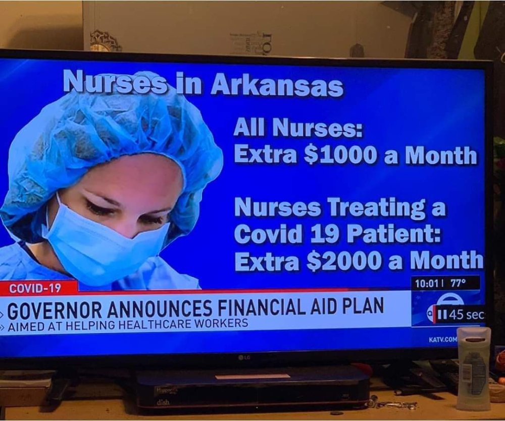 Oh here I'll praise another Republican, Asa Hutchison and Arkansas. It's not as much as it probably should be, but considering most states aren't giving anything extra to nurses to my knowledge, it's a start. Also Arkansas isn't in a full outbreak yet, so this is much earlier response than other states have done.