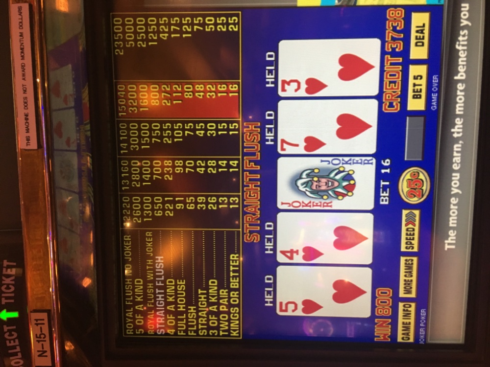 Here is just a brief report on last night’s play. My bank was 1,000 you can see most of it in the machine photo. I followed the rules I posted above and had hit only one quad on 9/6 JOB in like 5 hours. Decided to switch to Joker kings to hopefully entice some bigger hands to come in preserving bankroll. What happened was, the Mrs was plus 50 bucks on her nickle DDB game, the news on the Hurricane told us we better head home and shore up things on the deck, bring in some of the plants, and in general get ready. The beach is just down the street and we are on top of a hill. So after hitting a few quads on joker then this straight flush, following the same JOB betting pattern, we headed home mid afternoon. My credit total was fairly close to starting bank anyway. Hoping for the best tomorrow with the storm. Already cancelled our room.