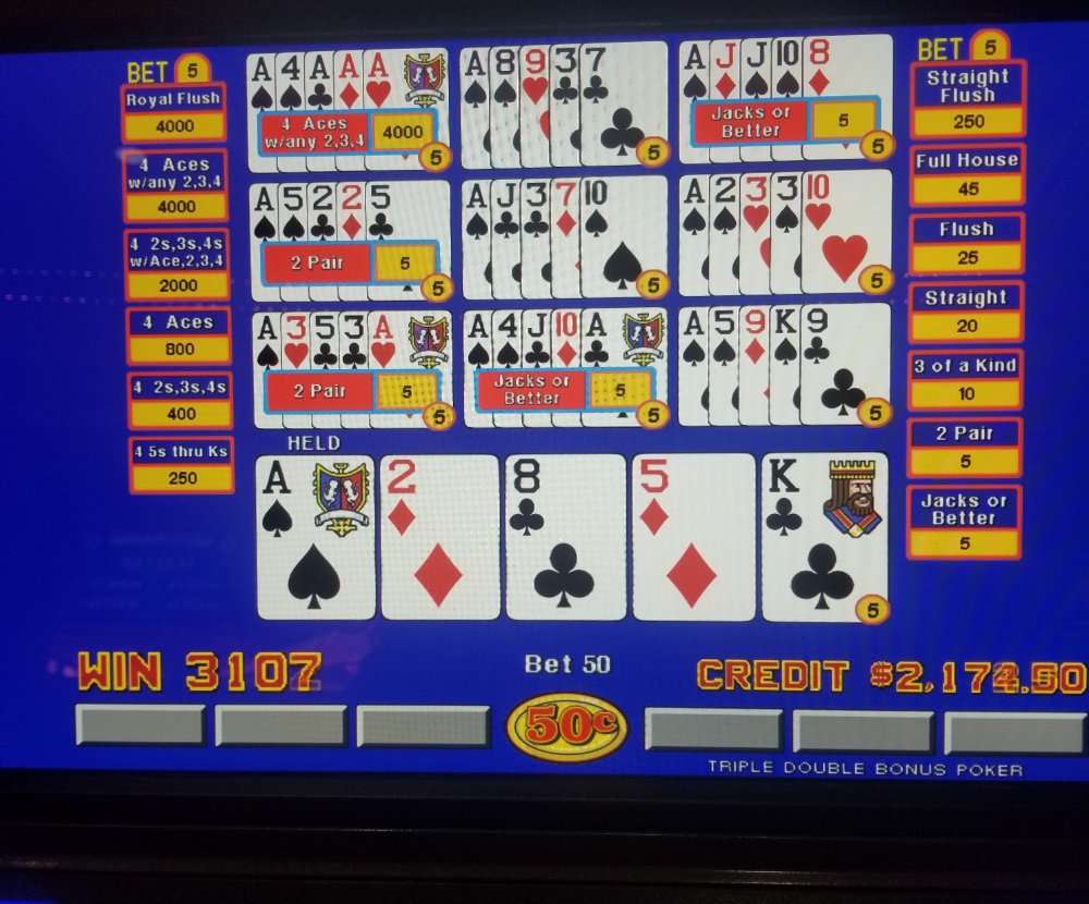 I was playing for a while and was hitting enough straight flushes and dealt hands to keep me interested when, playing TDB, I was dealt trip aces. Holding them I connected on 2 of them, one with a kicker. I was switching back and forth between ACJP and TDB for another hour when, after holding a pair of aces playing TDB, I connected with the other 2 and a kicker for another nice hit. I walked out a little while later but not before dropping $200.00 in a goofy penny slot machine.