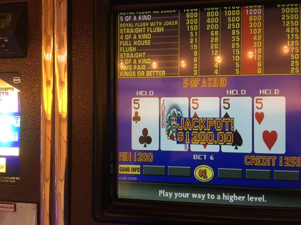 To answer your question, yes it is available in quarters, halves, and dollars. What happens with the Martingale Clone the way I play is if my bet takes me all the way up to 25 quarters and I am still losing, meaning when I get to bet 25 and lose 6 times that bet, I revert to remaining bankroll to dollar play. I have found over, over, and over again that switching to dollars on a long bad run almost always and I know this is crazy results in the machine hitting. I know. I know it makes no since and it is probably coincidence. So after I lost 6 times my bet at bet 5 dollars, I go to. bet 6 dollars. So far, I am always a net loser by the end of the year and am able as an itemized deduction to write off the Winnings as an itemized deduction up to the gross amount won. I get wacked badly by the state though on gross winnings to the tune of 7 percent with no writeoff ability. That sucks. I know I could adjust my bets somewhat to avoid this, but so be it. As to the last two hits, that was with the extra 100 free play I earned that day. I was late already and just started with dollar play. On the hit of 5 of a kind on Joker, I had lost 6 times my bet at bet 5 bucks so I moved up to bet six.