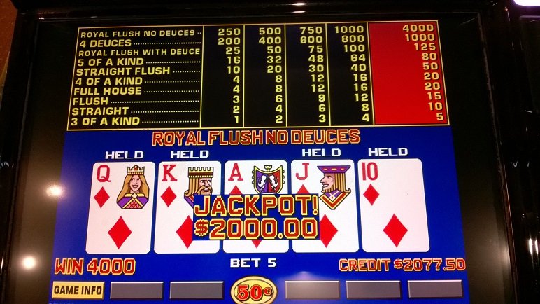 That’s great Wildman! Love it when the deuces hit after holding one. Nice Royal too by the way. Just curious. Do they have any Double Down Stud machines left down there? They are usually only 97 percent machines, but for a quarter before doubling, you get paid 200 bucks for a single quarter bet. Also you can play twice as many hands per hour as draw poker. I like them for a hit and run play, then settle in for the grind on Regular deuces. Congrats again. I need to settle down on my Martingale Clone. Have been upping my bets too fast lately. Should really wait until I am down 1/2 of what the deuces play before upping my bet instead of just waiting Five or six hands. Otherwise, bankroll will disappear on an ultra cold cycle before the deuces hit.