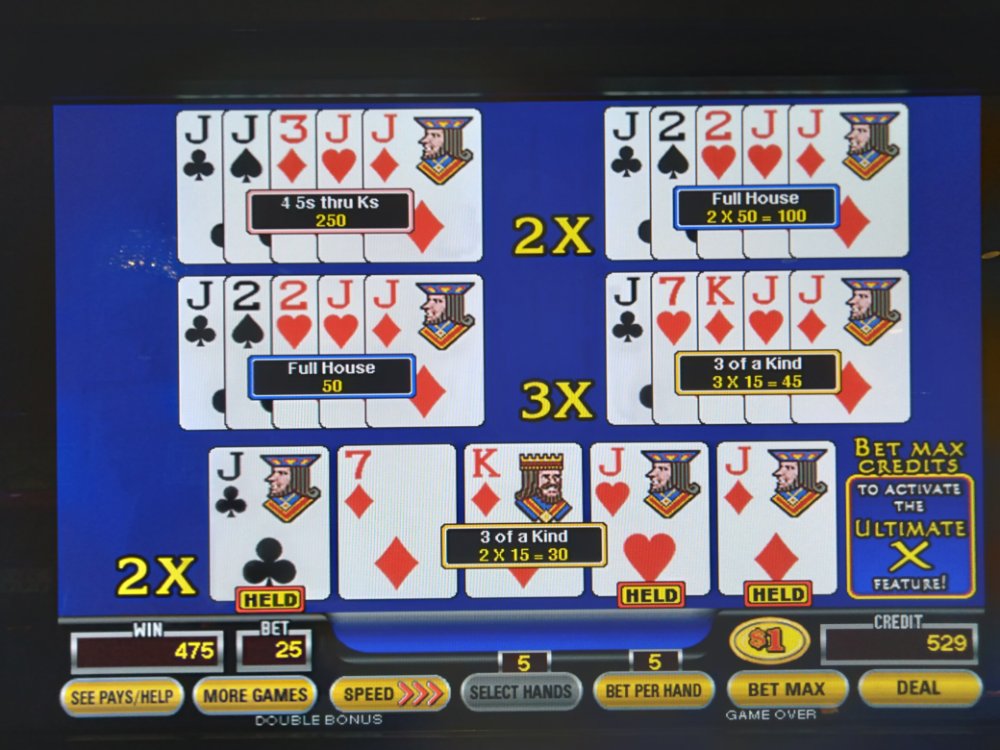 I went to my local casino Sunday morning, arriving at 1:45 just in time for last call, and a mostly empty casino just how I like it. I only brought 200, starting with Ultimate X 10 play ) 5 cent, and working up to a little over $500 with the help of 2 royals (no multipliers). I was going to cash out and leave, but due to security (downtown Cleveland), I go to the high limit room to cash tickets away from everything, and decided to play 100 on Triple Play DDB. Within the first 10 or so hands, I get dealt 3 aces: