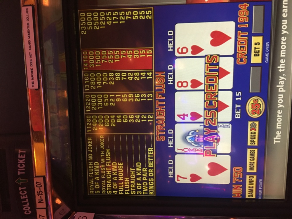 3 quads on JOB with 5 quarters bet first half hour before the downward spiral began. I was ahead about $60. When it took it back even I should have walked, chilled with an Amstel light and watched the news in the room then tried a different machine in another part of casino. Next trip, a Starbucks on arrival, then my nut job method. Walk up to an empty 9/6 JOB, as soon as ahead $1.25 move on. Set it and forget it!! The hardest part, finding enough 9/6 machines. Every other one is still shut off.