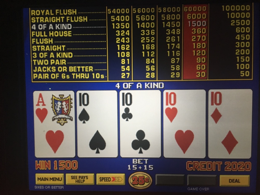 Heading up tonight with the Mrs. Last night, the lady playing next to me on 3 line super times pay DDB dollar game on the same All Star 2 machine , hit 4 hand pays in one hour. 4k twice, 1800, and 1300. Aces with a kicker twice and twos and threes with kickers all in one hour. Playing 3 line Suer Times pay. Pay table not good either.