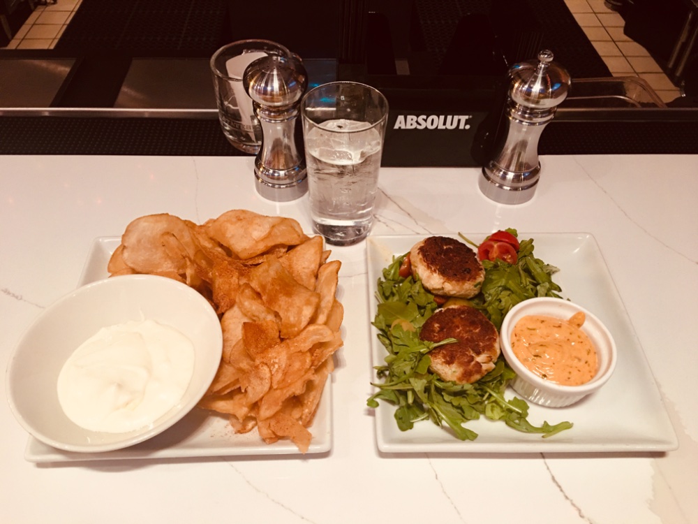 Water Dog encore. I had a couple of crab cakes, the best HH appetizer by my reckoning. They came on a bed of arugula and grape tomatoes. The vinaigrette was superb. Next time, I must bring my own rolls from nearby Formica for succulent sliders. Unfortunately, I chose the potato chips and blue cheese dip. This junk food is just empty calories and not worth most of them. You do get what you pay for. The bartender has Roseanne Barr’s distinctive cackling laugh, and often employs it. It’s almost comforting.
