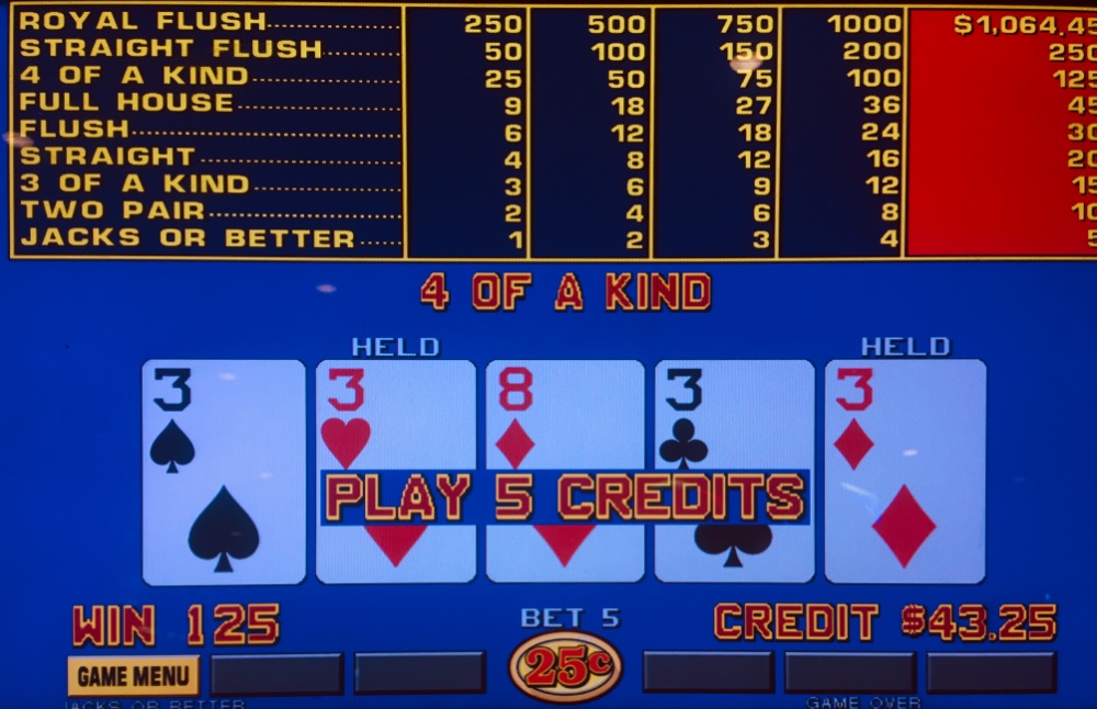 Fair Friday. I lost my $25 Caesars table FP on an eight to craps. I won $33 on my $25 machine FP. It took an hour to hit my first quad. Coffee break and bump to dollar BP. It was turbulent and I had to pare back quad hand. I later hit a third quad. Water Dog lunch. I decided against a Borgata trip, given recent outcomes. Net Day: +$85. 86 TCs.