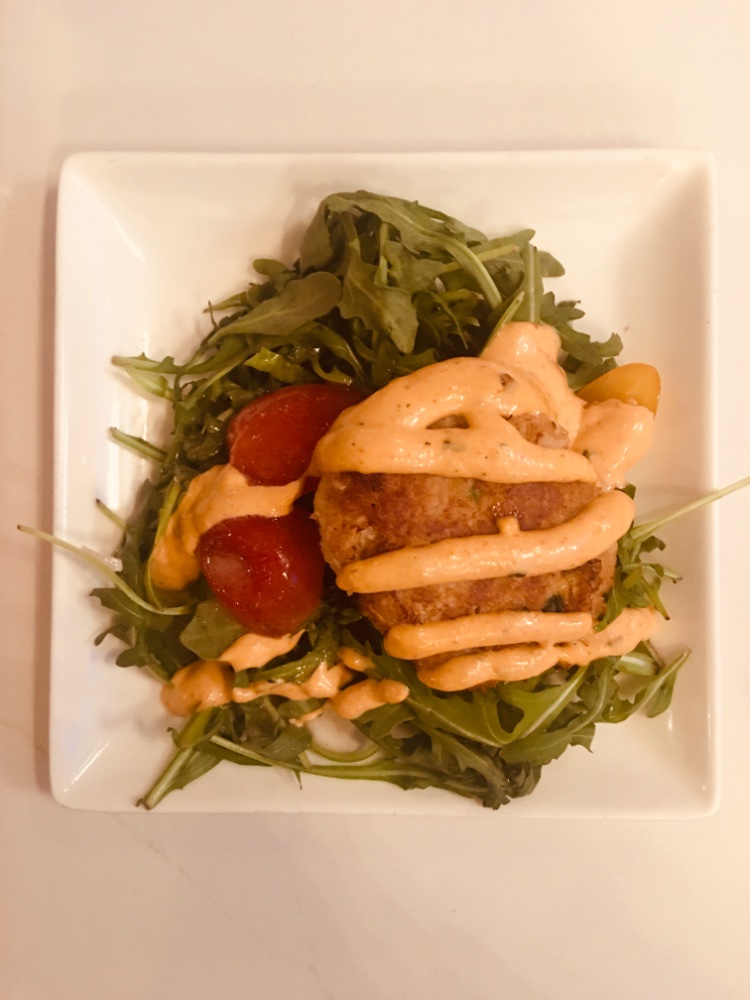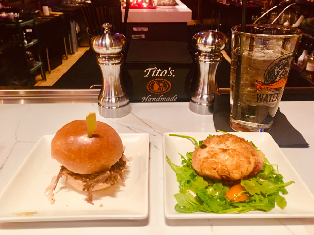Happy Hour inflation hit. Crab cake portion -50%, but price -22%. New Water Dog menu really is a dog. Lump of coal feeling for me. I will henceforth lean towards the cheeseburger, pork and short rib three buck sliders. The latter is on the left.