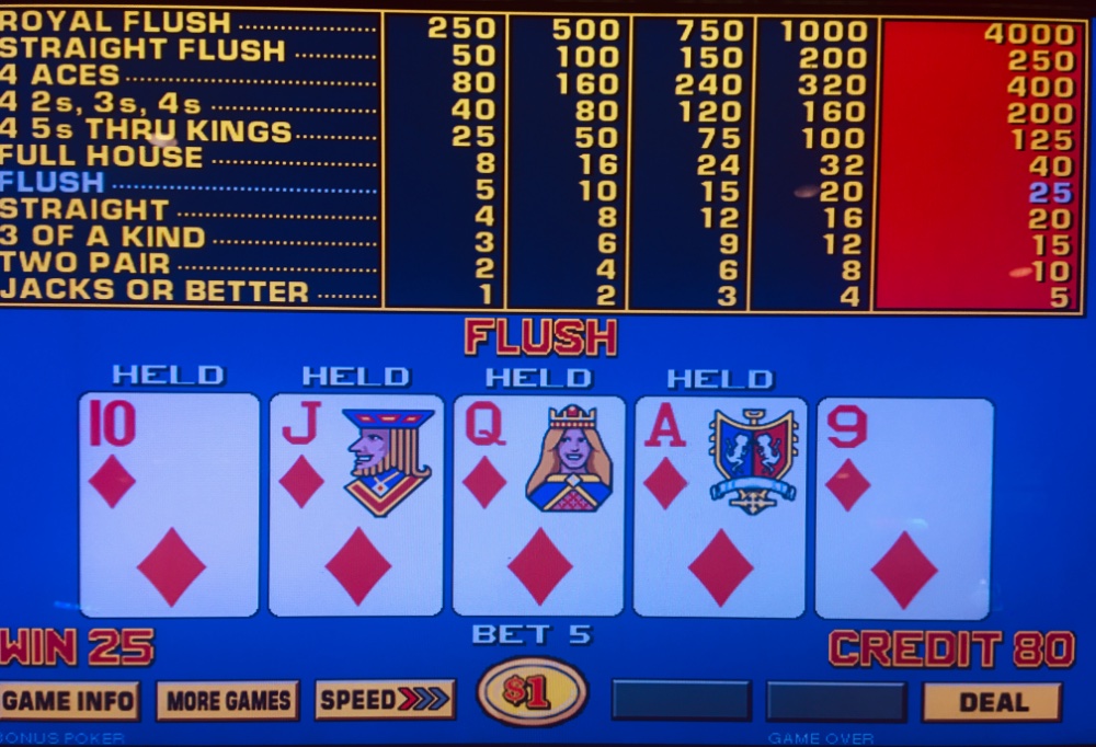 Yes, a fleeting glimpse of a possible 4,000 hand pay and a minor insult by completing the Straight Flush with a short coin bet. At least it was a plus day. Hard to come by lately for me.