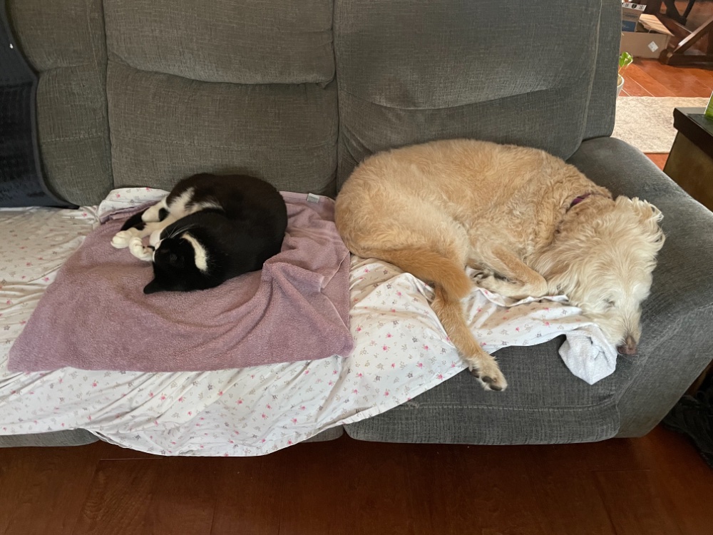 Today, the cat moved over a bit too much and stole Ginger’s spot. Awwwww!